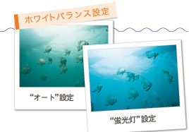 水中を"オート"で撮影するとほとんどの場合、緑かぶり(全体が緑色っぽく写ること)になってしまう。そこでホワイトバランスを"蛍光灯"に設定すると、適度に緑かぶりを抑え、青をきれいに出すことができる。状況に応じて"太陽光"と使い分けよう。機種によっては、"水中モード"もあるのでその場合は、"水中モード"を使おう。