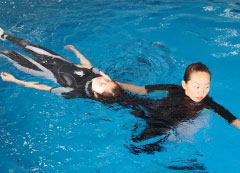 | マスクやフィンの脱着、レスキュートレーニングを行います。 トラブルを起こしたスノーケラーの対処、曳航方法、エキジット方法、水面での人工呼吸の曳航方法を身につけます。 |