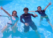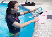 | 学科が終わったらプールで練習! 器材の準備と使い方を実際にプールを使ってお教えします。 スノーケルやフィンの正しい使い方から、足がつったときの対処法までご紹介♪ インストラクターとプールで練習できるから安心・安全! |