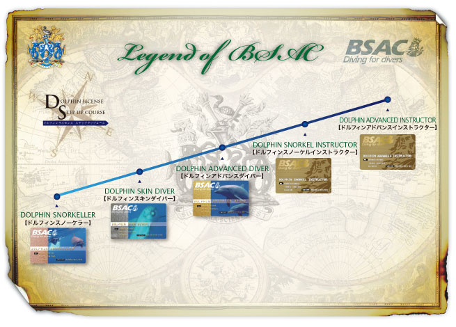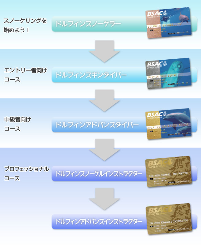ドルフィンライセンス各コースを受講する際には下図のコースシステムにしたがってステップアップしていくことが望ましいでしょう。